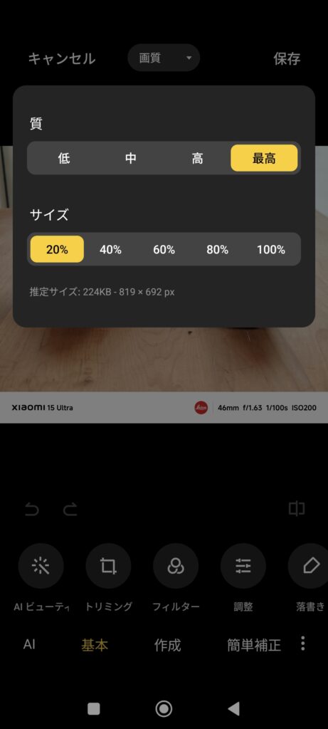 Xiaomi 15 T は、撮影時の解像度を 【超高】【高】【標準】【低】のから選べました。